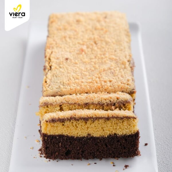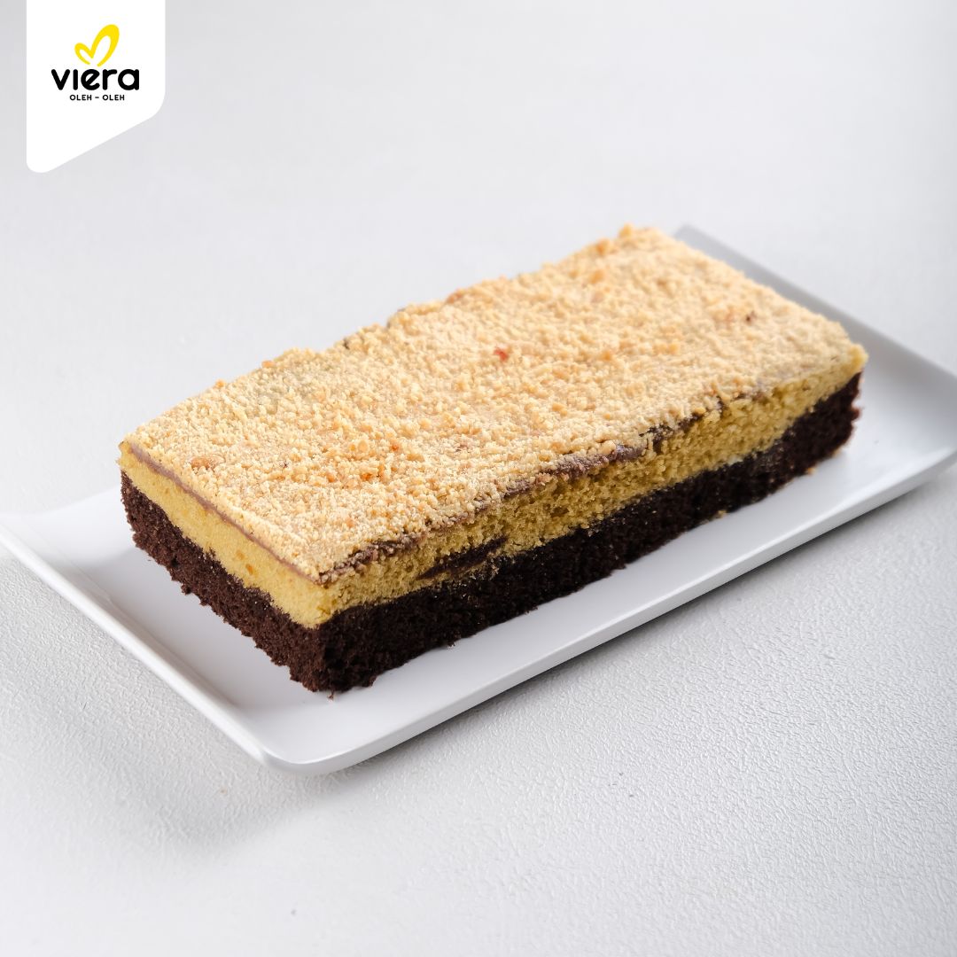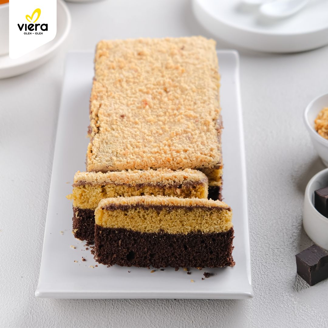Produk brownies 2 lapis rasa mocca. Tekstur lembut dan moist, aroma mocca dan kacang, rasa manis dan gurih. Daya tahan 3 hari di suhu ruang