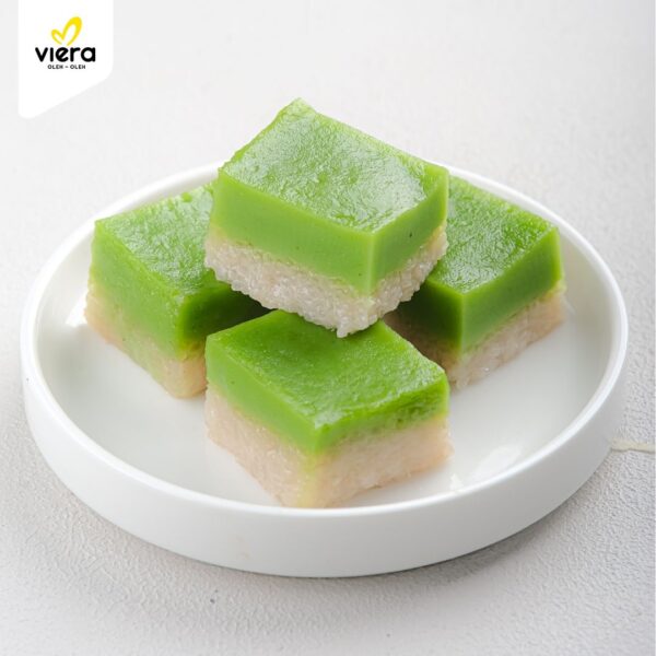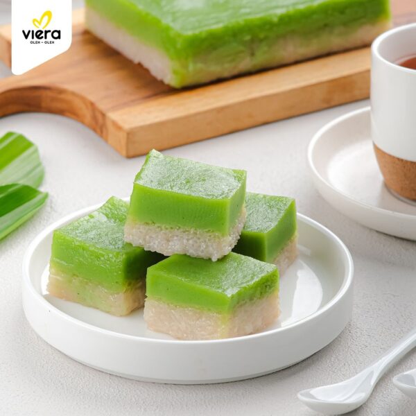 Produk persegi panjang 2 lapis rasa pandan. Berwarna hijau dan putih. Tekstur lembut dan kenyal, aroma pandan, rasa manis dan gurih. Daya tahan 24 jam di suhu ruang. Value produk: menggunakan daun pandan asli.