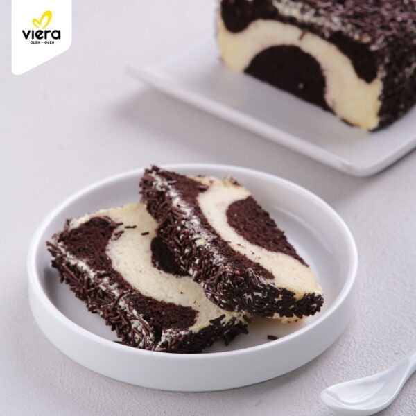 Produk cake kukus marble dengan topping coklat ceres. Berwarna coklat dan putih. Tekstur lembut dan moist, aroma coklat, rasa manis dan gurih. Daya tahan 3 hari di suhu ruang.